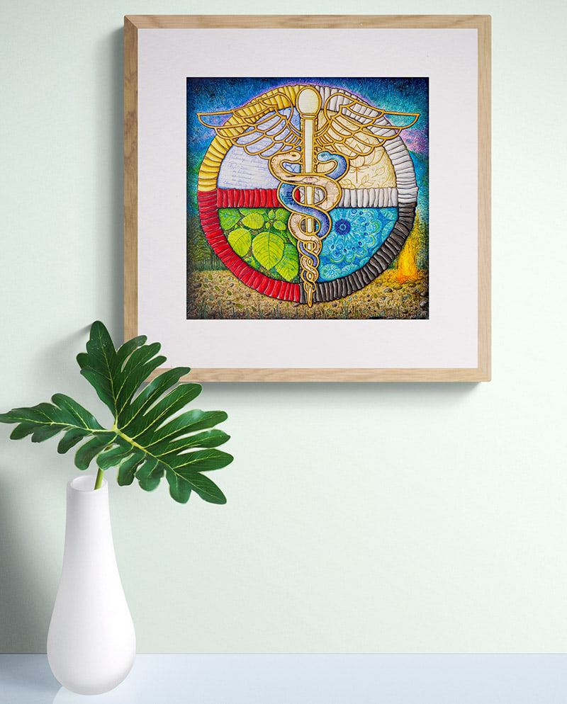 At its core is the medicine wheel, inspired by the First Nations of North America. It represents the four directions, life cycles, and the interconnectedness of all things. Overlaid is the caduceus, the ancient Greek symbol of balanced dualities—masculine and feminine, science and spirit, past and future.