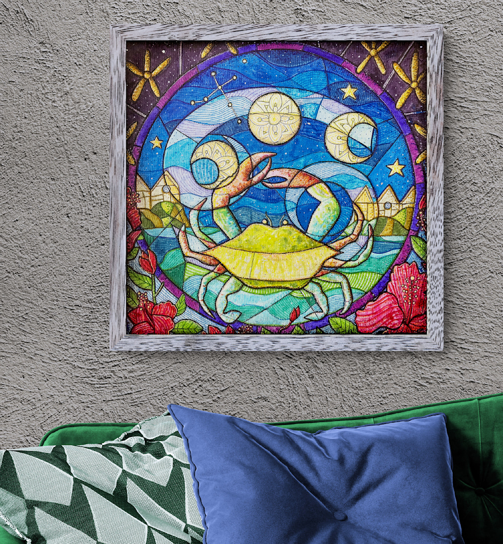 In this image, a moonlit crab from North America stands guard on the shore, embodying Cancer’s protective and nurturing traits. The crab skillfully juggles moon phases styled in Asian mandala patterns, symbolizing the sign's deep connection to intuition and emotion. In the distance, thatched beach huts from South America reinforce the theme of home and security. Surrounding the scene, hibiscus flowers from Oceania represent Cancer’s love for comfort and nature. Ancient Egyptian-styled stars from Africa twinkle in the sky, reflecting Cancer’s guiding light and dreamy nature. Above, the constellation Cygnus, prominent in Europe's summer sky, represents a swan, known for strong family bonds—a trait highly valued by Cancers.